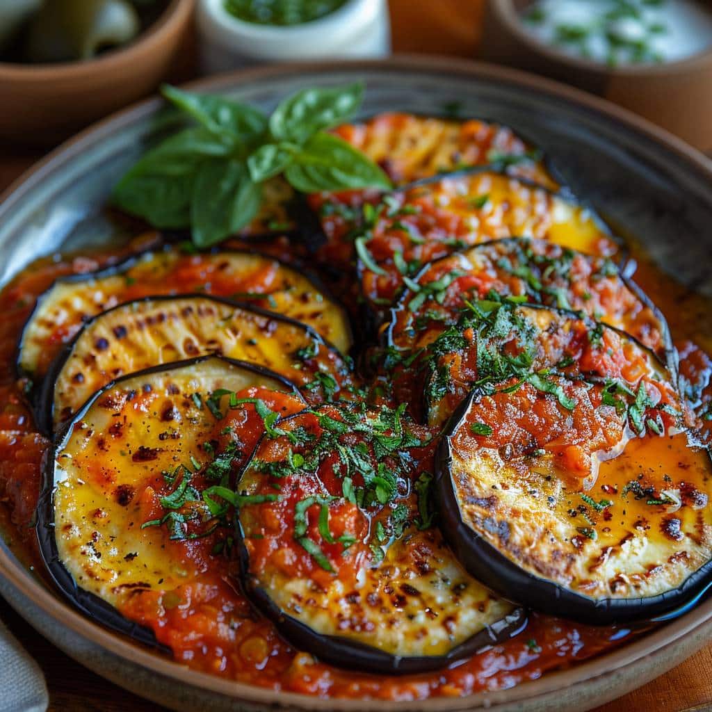 Pour ceux qui préfèrent une alternative plus légère, il est possible de cuire les tranches d’aubergines au four. Badigeonnez-les légèrement d’huile et disposez-les sur une plaque recouverte de papier sulfurisé. Faites-les cuire à 200°C jusqu’à ce qu’elles soient dorées et légèrement croustillantes. Cette méthode offre une option plus saine tout en conservant une texture agréable.